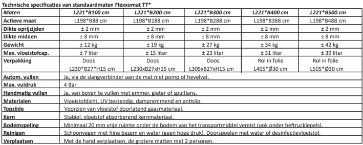 De ondergrond, waarop de Flexxomat wordt geplaatst, dient vlak en schoon te zijn. Oneffenheden en vervuiling kunnen de levensduur van de Flexxomat TT sterk verminderen, speciaal bij zware belastingen. Optimale levensduur en gebruik wordt verkregen op een goed afgewerkte betonnen ondergrond. De vloer moet bij voorkeur niet onder afschot liggen. De mat zal hierdoor niet goed evenredig gevuld worden en ongewenst vloeistof loslaten aan de lager geleden zijde.